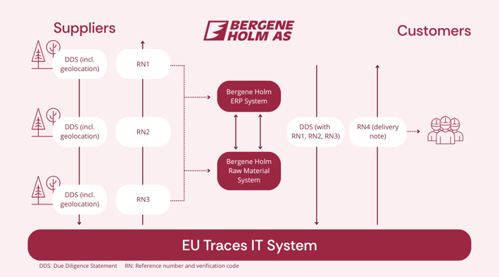 Sammen med andre aktører innen skog- og treindustrien, utvikler Bergene Holm en IT-løsning for digital deling av EUDR-informasjon. Dette arbeidet pågår i henhold til prosjektplanen. Første versjon av systemet vil være ferdigstilt i løpet av høsten 2025, og de tekniske detaljene som kreves for å ta systemet i bruk, vil publiseres så snart de er klare.