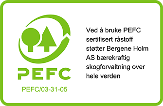 All trelast og flis fra Bergene Holm AS er miljøsertifisert i henhold til de miljøkrav PEFC-systemet stiller. Det betyr at vi har kontroll på tømmerets opprinnelse og vet at alle våre tømmerstokker er avvirket etter de strengeste krav til miljøhensyn som stilles.