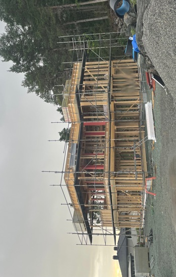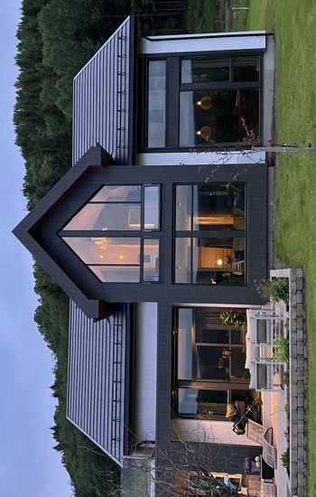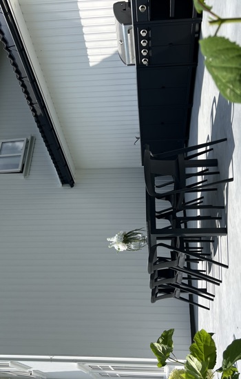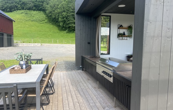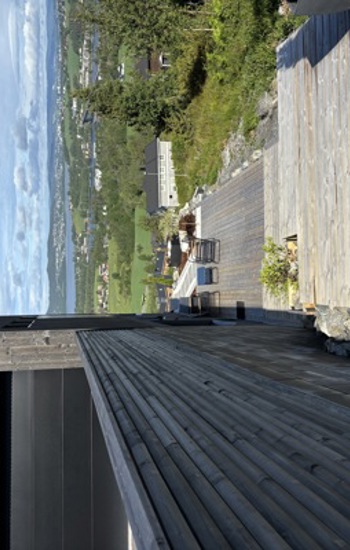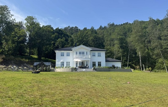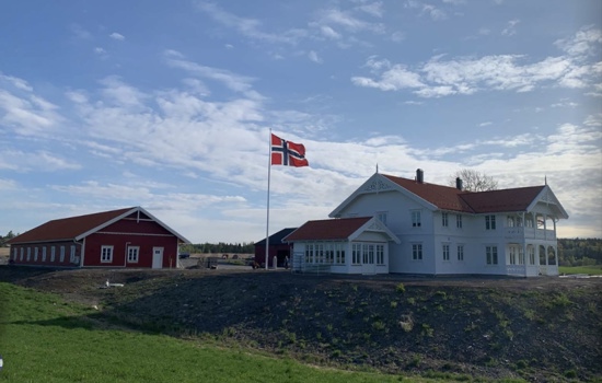 Etter å ha restaurert og pusset opp det gamle gårdshuset, ble boligen dessverre totalskadet i en brann rett etter ferdigstillelse. Familien måtte tenke nytt – og valget falt på å bygge et nytt hus i sveitserstil, med respekt for den gamle bygningens uttrykk og plass i tunet.